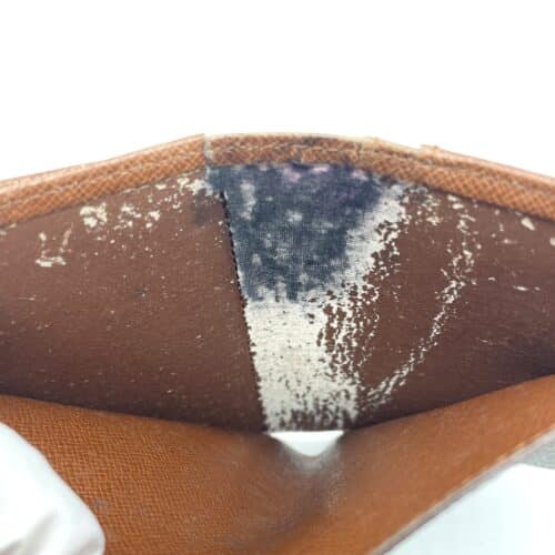 今回修理を承ったモノグラム・ポルトフォイユ・ヴィエノワは、外側のモノグラム・キャンバスには目立つ大きなダメージはないものの、長年のご愛用によって、札入れの内装部分に深刻な劣化が見られました。 写真でご覧いただけるように、札入れの内張りが広範囲にわたり剥がれており、内装の下地に使われている白い芯材がむき出しになっています。これは、ルイ・ヴィトン製品の一部内装に使われる合成素材が、日本の高温多湿な環境や経年によって加水分解を起こし、表面のコーティングが剥がれてしまうという、この素材によく見られる症状です。 この状態を放置しておくと、財布の機能性が大きく損なわれてしまいます。剥がれた内装の破片がお札にくっついてしまうため、レジ前などでお札を出す際に大変不便になります。また、剥がれた内装同士が貼り付くことで、お札やカードの出し入れが困難になります。 さらに、財布を開くたびにこの剥がれた内装が見えることで、ヴィトンの持つ高級感が損なわれ、見た目も悪くなってしまいます。札入れは財布の顔とも言える部分です。このままの状態でのご使用は快適ではないため、今回は内装を完全に新しい素材に張り替える修理が必要となりました。