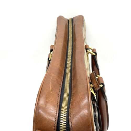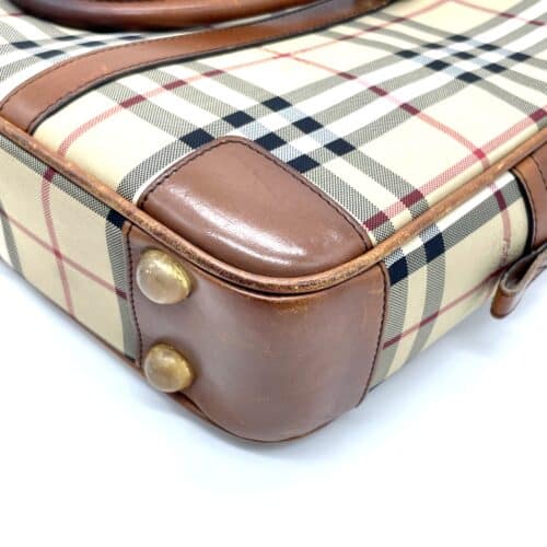 今回お預かりしたのは、バーバリーの代名詞であるチェック柄を大胆にあしらった、非常にクラシックな佇まいのビジネスバッグです。 まず目を引くのは、ブランドのアイデンティティを象徴するキャンバス地のチェックパターンです。この洗練された格子模様(チェックパターン)と、ハンドルや四隅に配置された落ち着いたトーンのブラウンレザーの組み合わせは、まさに英国紳士のような品格と誠実さを感じさせます。ビジネスシーンにおいて、これほどまでに存在感を放ちつつも、派手すぎず知的な印象を与えるバッグは他にありません。 各パーツを細かく見ると、堅牢なハンドルや重厚感のある金具、そして底部を補強するレザーの切り替えなど、機能性と美しさが高度に融合していることがわかります。特に、しなやかでありながら適度な厚みを持つ上質なレザーは、使い込むほどに手に馴染み、持ち主と共に時を重ねてきた「信頼感」を演出しています。 長年、大切に使い続けられてきたことが一目でわかる、非常にコンディションの良い一品です。今回は、この気品あふれるバッグの魅力をより永く維持するため、レザー部分を中心に細やかなカラーリペアを施していきます。