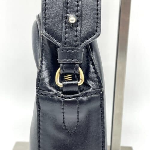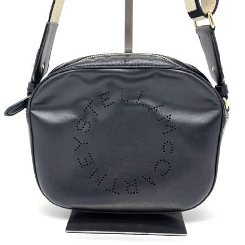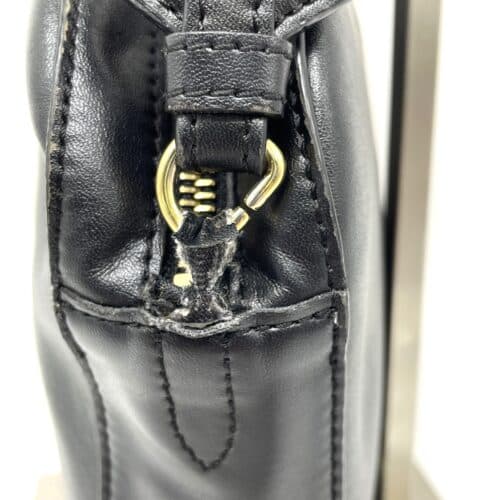 今回お預かりしたのは、ステラマッカートニーを象徴する「ステラ ロゴ」シリーズのショルダーバッグです。このバッグの最大の魅力は、フロントに施されたサークル状のロゴパンチング加工にあります。一般的なブランドバッグのように金具やプリントでロゴを主張するのではなく、レザーに精密な穴を開ける「抜き」の技法で表現されているのが特徴です。このパンチングが生み出す控えめながらも奥行きのある表情は、ロゴ自体がデザインの主役でありながら、背景の素材感を透過させることで、どんなコーディネートにも溶け込む軽やかさを生み出しています。使用されている「エコレザー」は、動物愛護を掲げるブランドの誇りそのもの。本革に劣らない滑らかな質感と上品な光沢を持ちつつ、パンチング加工に耐えうるしなやかさと強靭さを兼ね備えています。シックなブラックのボディに対し、スポーティーな印象を与える太めのショルダーストラップが組み合わさることで、現代のライフスタイルにマッチする絶妙なバランスを保っています。オーナー様の日々に寄り添ってきたこの美しいデザインを維持するため、今回は負荷のかかりやすいストラップ接続部の修理を行っていきます。
